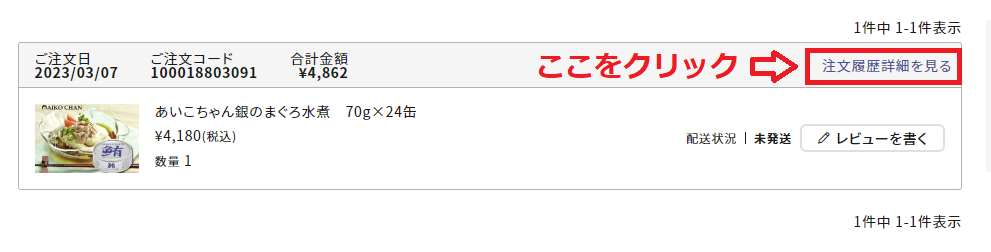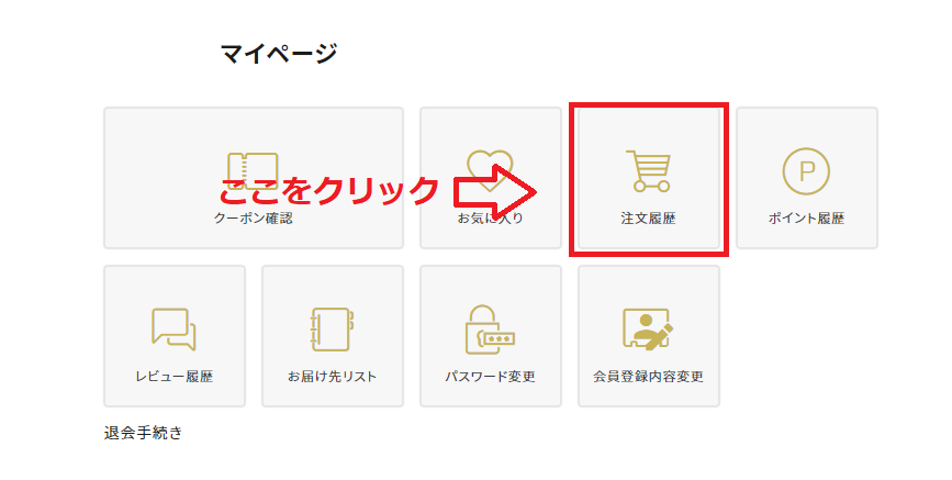 1.マイページにログインし、注文履歴ページを開く。