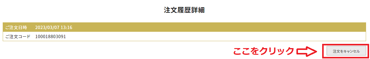 ご注文内容を確認し、「注文をキャンセルする」をクリックしてください。キャンセル依頼が完了すると、「ご注文がキャンセルされました」というメールが届きます。