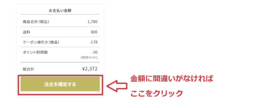 お支払いの総額がご確認いただけます。 内容にお間違いがなければ、「注文を確定する」ボタンをクリックしてください。 お支払い方法で「楽天ペイ」「PayPay」をお選びいただいた場合は、決済画面に進みます。