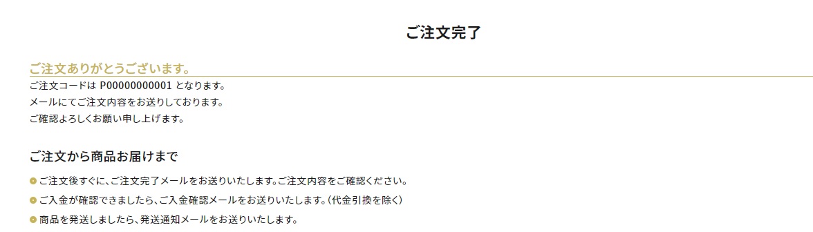 ご注文が完了しますと、お客様のご注文番号が表示されますので、お控えください。 ご注文完了後、ご登録いただいたメールアドレスに注文完了メールをお送りいたします。 メールが届かない場合は、お手数ですがお問い合わせフォームよりご連絡ください。