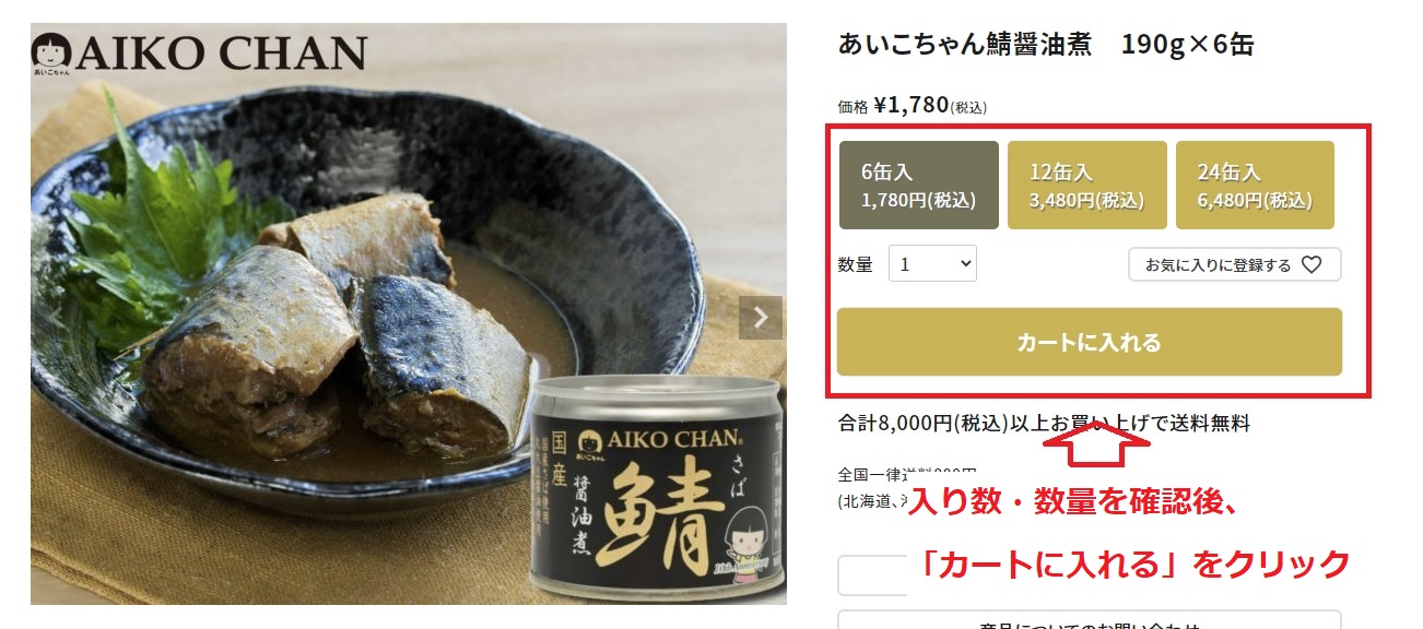 商品の内容、入り数、数量を確認し、「カートに入れる」ボタンをクリックしてください。