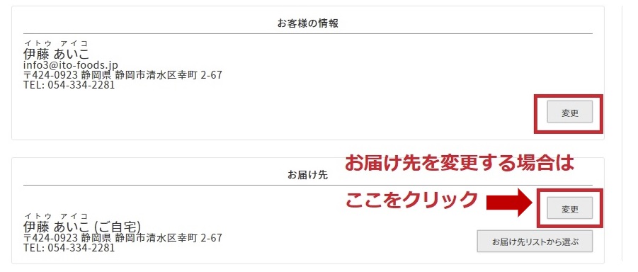 お客様情報、お届け先に間違いがないかご確認ください。 内容を変更する際は、変更ボタンをクリックしてください。