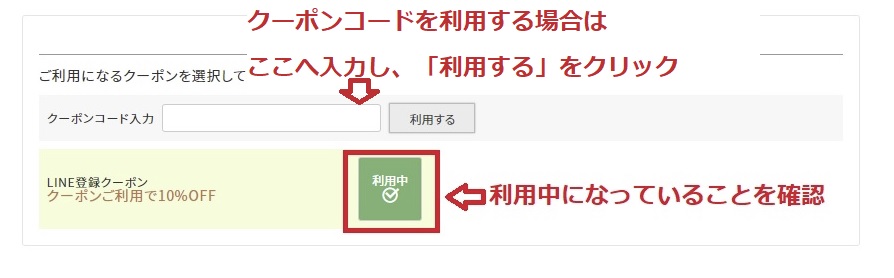 ご利用可能なクーポンが表示されます。 ご利用したいクーポンに「利用中」の緑色のボタンが表示されていることをご確認ください。 クーポンのご利用を取り消す場合は、「利用中」の緑色のボタンをクリックしてください。クーポンコードをご利用の場合(LINE友だち追加クーポン等)は、クーポンコードを入力し、利用するボタンをクリックしてください。