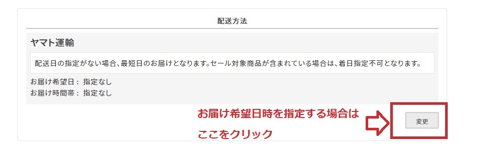 お届け希望日時がある場合は、「変更」ボタンをクリックし、希望日時を選択してください。 指定がない場合は、最短日でのお届けとなります。
